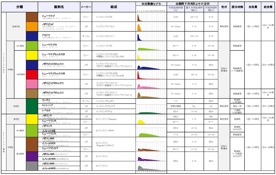 糖尿病治療に用いられるインスリンは、構造と作用時間で分類される。体内のインスリンと同じ構造を持ったものはヒトインスリンで、その構造の一部を変えることで作用時間などを調節したものがインスリンアナログである。また、作用時間による分類として、超速効型、速効型、中間型、持効型、混合型がある。このうち混合型は、基礎分泌と食事後の追加分泌の両方を一度に補うことができ、注射回数を減らせられるのがメリットである。