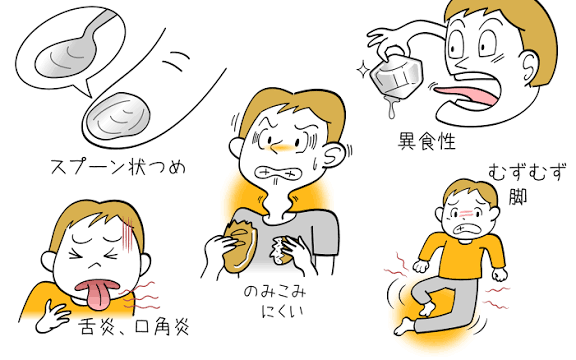 鉄欠乏性貧血になると「息切れ」「動悸」「めまい」「頭重感」「顔色が悪い」「立ちくらみ」「疲れやすい」などの症状が見られることがあります。また、鉄が不足することで「爪の変形」「氷を食べたくなる症状」が現れることもあります。