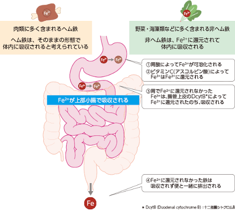 貧血予防には、鉄分を多く含む食品を効率よく摂ることが大切です。食品に含まれる鉄分には、野菜や卵、牛乳に含まれる「非ヘム鉄」と、レバーや赤身魚、肉類に含まれる「ヘム鉄」があります。「非ヘム鉄」は2価又は3価の鉄化合物で、細胞内に取り込む際は2価の鉄イオンに変化させる必要があります。