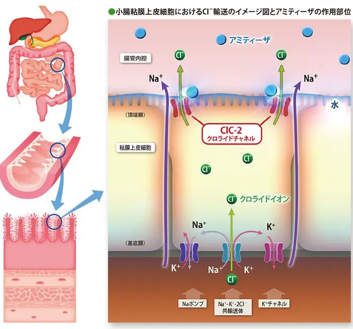 クロライド(Cl-)イオンを腸管内に移行させます。