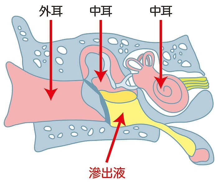 アデノイド肥大や鼻すすりの癖などを原因とし、中耳が陰圧(真空に近い状態)になることで滲出液が溜まってしまい、炎症を起こします。